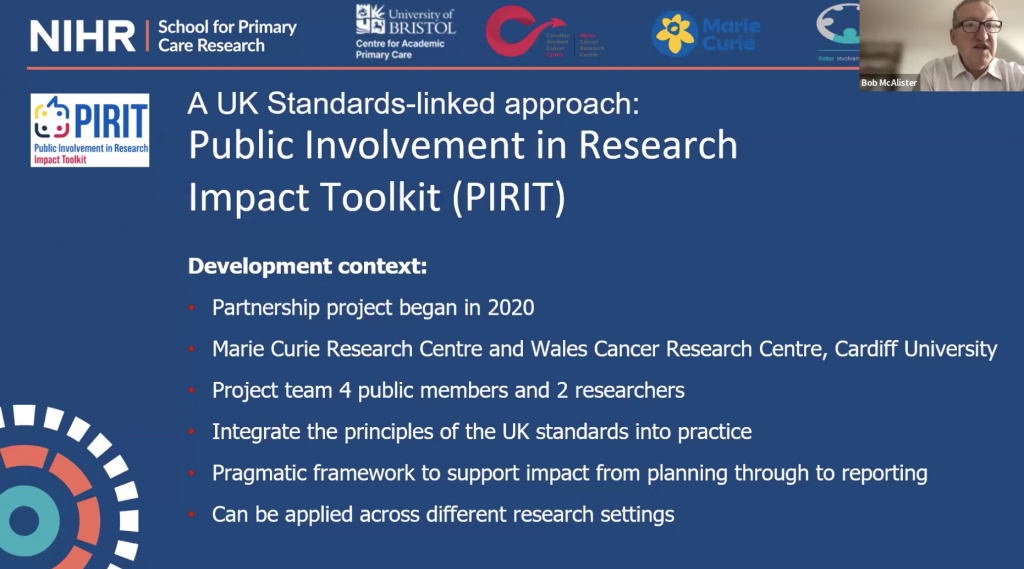 I was recently invited by Alisha to join her in presenting about PIRIT to a seminar organised by People in Health West of England, or PHWE, a network of people and organisations who work together to promote a strong public voice to improve research in health and social care services across the West of England region. The learning and development session was jointly hosted by People in Health West of England, the University of Bristol’s Centre for Academic Primary Care (Alisha’s new employer), the NIHR’s School for Primary Care Research, and Cardiff University. The ground to cover- What are the different approaches that can be used when evaluating public involvement? What resources can we use when planning and evaluating involvement?